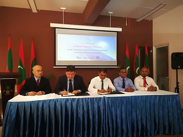 2017年12月6日,公司副總經(jīng)理肖向東與馬爾代夫能源部部長Thoriq Ibrahim 就該國SHAVIYANI 和 NOONU ATOLL環(huán)礁太陽能-柴油聯(lián)合發(fā)電項目簽署總承包合同,此項目是中機合作在馬爾代夫的第一個總承包項目。公司工程一部總經(jīng)理王旭光及相關(guān)合作單位參加了簽約儀式。