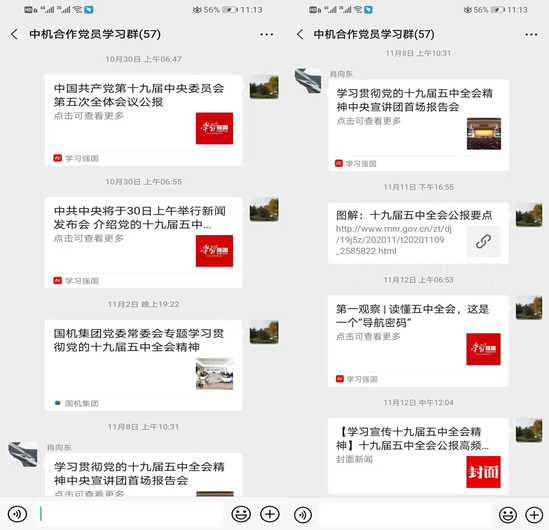 第一時(shí)間利用微信群宣貫十九屆五中全會(huì)精神。10月30日,中機(jī)合作即在公司黨員學(xué)習(xí)群轉(zhuǎn)發(fā)《中國(guó)共產(chǎn)黨第十九屆中央委員會(huì)第五次全體會(huì)議公報(bào)》。11月8日,轉(zhuǎn)發(fā)學(xué)習(xí)貫徹黨的十九屆五中全會(huì)精神中央宣講團(tuán)首場(chǎng)報(bào)告會(huì)視頻,11日、12日,又分別轉(zhuǎn)發(fā)《圖解:十九屆五中全會(huì)公報(bào)要點(diǎn)》《第一觀察|讀懂五中全會(huì),這是一個(gè)“導(dǎo)航密碼”》《十九屆五中全會(huì)公報(bào)高頻詞解析》等等,指導(dǎo)廣大黨員學(xué)習(xí)十九屆五中全會(huì)精神。