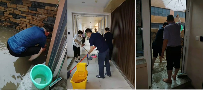險(xiǎn)情就是命令。在汛情防控領(lǐng)導(dǎo)小組下,公司迅速啟動(dòng)汛情防控方案。說時(shí)遲那時(shí)快,在公司領(lǐng)導(dǎo)王旭光指揮下,綜合管理部、安全辦同事合理進(jìn)行分工和配合,迅速投入行動(dòng)。不管是公司領(lǐng)導(dǎo)還是部門負(fù)責(zé)人,不管之前是司機(jī)、電工還是管理人員,大家齊心協(xié)力一起向前沖。有人快速和物業(yè)聯(lián)系協(xié)調(diào),爭(zhēng)取物業(yè)支持;有人不顧暴雨如注,沖上平臺(tái)查找原因,疏通下水管道;有人迅速投入清理室內(nèi)雨水的戰(zhàn)斗。你拿起撮斗,他提起笤帚,你拿起拖把,他提起“水桶”,拖的拖、掃的掃,有人舀水有人倒。有人赤腳上陣,有人光背出征;室外人瞬間衣服被大雨澆透而不顧,室內(nèi)人你來我往爭(zhēng)先空后大汗流,場(chǎng)面十分熱烈而有條不紊,手酸背痛而不停歇。