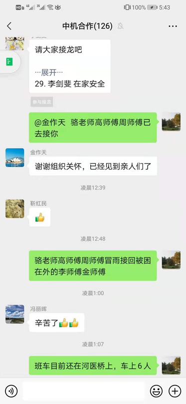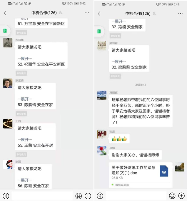 為使職工早日安全返家,中機(jī)合作領(lǐng)導(dǎo)學(xué)史力行,積極踐行“以人民為中心”的思想理念,把職工生命和健康安全放在第一位,立即成立汛情防控領(lǐng)導(dǎo)小組,公司黨委書記、執(zhí)行董事、總經(jīng)理郭春陽親自掛帥,擔(dān)任領(lǐng)導(dǎo)小組組長,公司領(lǐng)導(dǎo)班子成員擔(dān)任領(lǐng)導(dǎo)小組組員。汛情防控領(lǐng)導(dǎo)小組審時(shí)度勢(shì),及時(shí)果斷決策,提前下班,班車提前發(fā)車。同時(shí),由公司副總經(jīng)理王旭光帶隊(duì),綜合管理部、安全生產(chǎn)辦公室負(fù)責(zé)同志等人員留守巡查值班,確保公司財(cái)產(chǎn)安全。對(duì)于無法回家的職工及因無法回家而到公司的職工家屬,公司統(tǒng)一安排晚餐和住宿。同時(shí),啟動(dòng)公司兩級(jí)安全管理體系,并要求各部門負(fù)責(zé)人和安全員切實(shí)履職盡責(zé),和部門職工保持密切聯(lián)系并組織公司全體員工在微信群通報(bào)安危和行程。