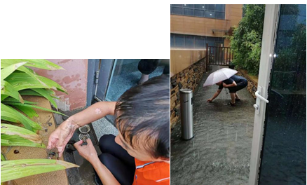 隨著雨水越來越大, 8樓東側(cè)平臺告急,雨水即將漫進8樓餐廳。駱亞斌同志迅速聯(lián)系物業(yè)協(xié)調(diào)防洪沙袋,并帶領(lǐng)周亞同志等人去搬取沙袋。綜合部的張明筠拿來螺絲刀,冒著暴雨撬下水道口并疏通下水口,終于下水口鋼絲網(wǎng)撬開了,可是水仍在快速上漲。張明筠二話不說,立即提起水桶又沖進了暴雨中,高培君也拿起水桶緊隨其后,瞬間,他們被雨水澆透,一桶、兩桶、三桶……一桶桶積水被傾倒至樓下,但是由于雨水太急太猛,平臺的積水仍在上漲,很快,雨水開始向餐廳倒灌。一場緊張的戰(zhàn)斗開始了,張明筠和高培君將沙袋緊緊從外面堵住門口,隨后,他們從窗口跳進室內(nèi),和其他同志們一起,用拖把、笤帚、撮斗、垃圾桶,掃的掃、拖的拖、倒的倒,一刻也不敢停歇??此坪唵蔚膭幼?,因為需要快速不斷重復,同志們個個手酸腰痛,甚至累到手抽筋。歷經(jīng)半個多小時的緊張戰(zhàn)斗,餐廳地面的水終于被逐漸清理干凈。