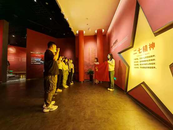 在紀念堂精神指引部分,全體黨員面向黨旗,在二七精神的背景墻前,重溫入黨誓詞,牢記初心使命。
